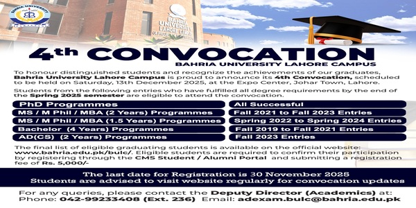 4th convocation ceremony of Bahria University Lahore Campus will be held on Sat, 13 December 2025, at Expo Centre Johar Town Lahore