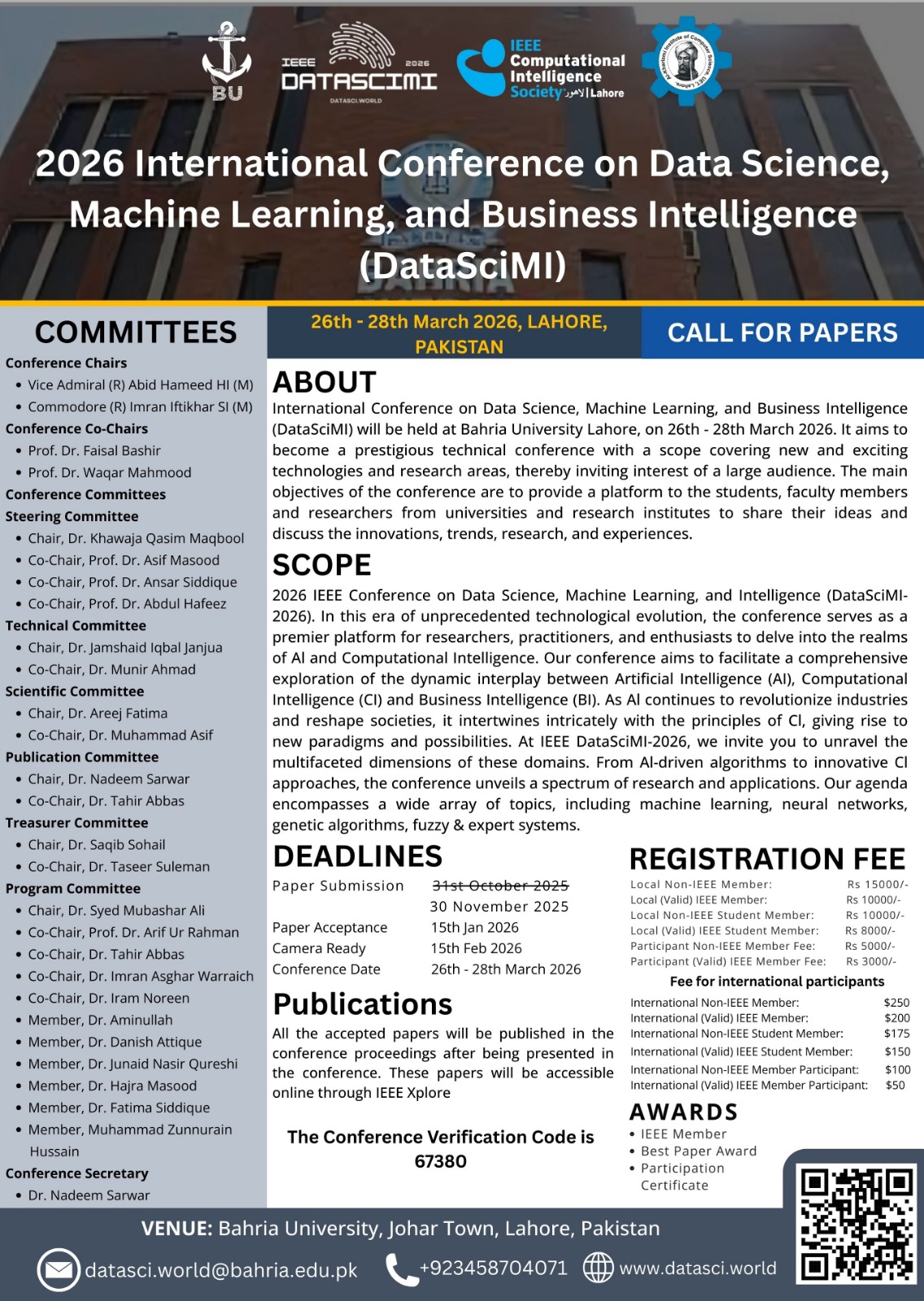 Bahria University Lahore Campus proudly invites researchers, academics, innovators, and industry professionals to submit their original and impactful research to the 1st IEEE International Conference on Data Science, Machine Learning & Intelligence (DataSciMI-2026).